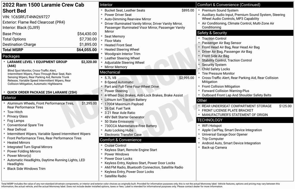 *Adaptive Cruise Control, Heated and Cooled Seats, Touchscreen Controls, Backup Camera, Automatic Headlights, Apple CarPlay, Android Auto, Voice Recognition, REMOTE START, AWD / 4x4 / Four Wheel Drive, Auto High Beam Headlamp Control, Blind Spot & Cross Path Detection, Foam Bottle Insert (Door Trim Panel), Laramie Level 1 Equipment Group (DISC), ParkSense Front/Rear Park Assist w/Stop, Quick Order Package 25H Laramie, Rain Sensitive Windshield Wipers, Rear 60/40 Folding Split Recline Seat, Rear Underseat Compartment Storage, Remote Tailgate Release.